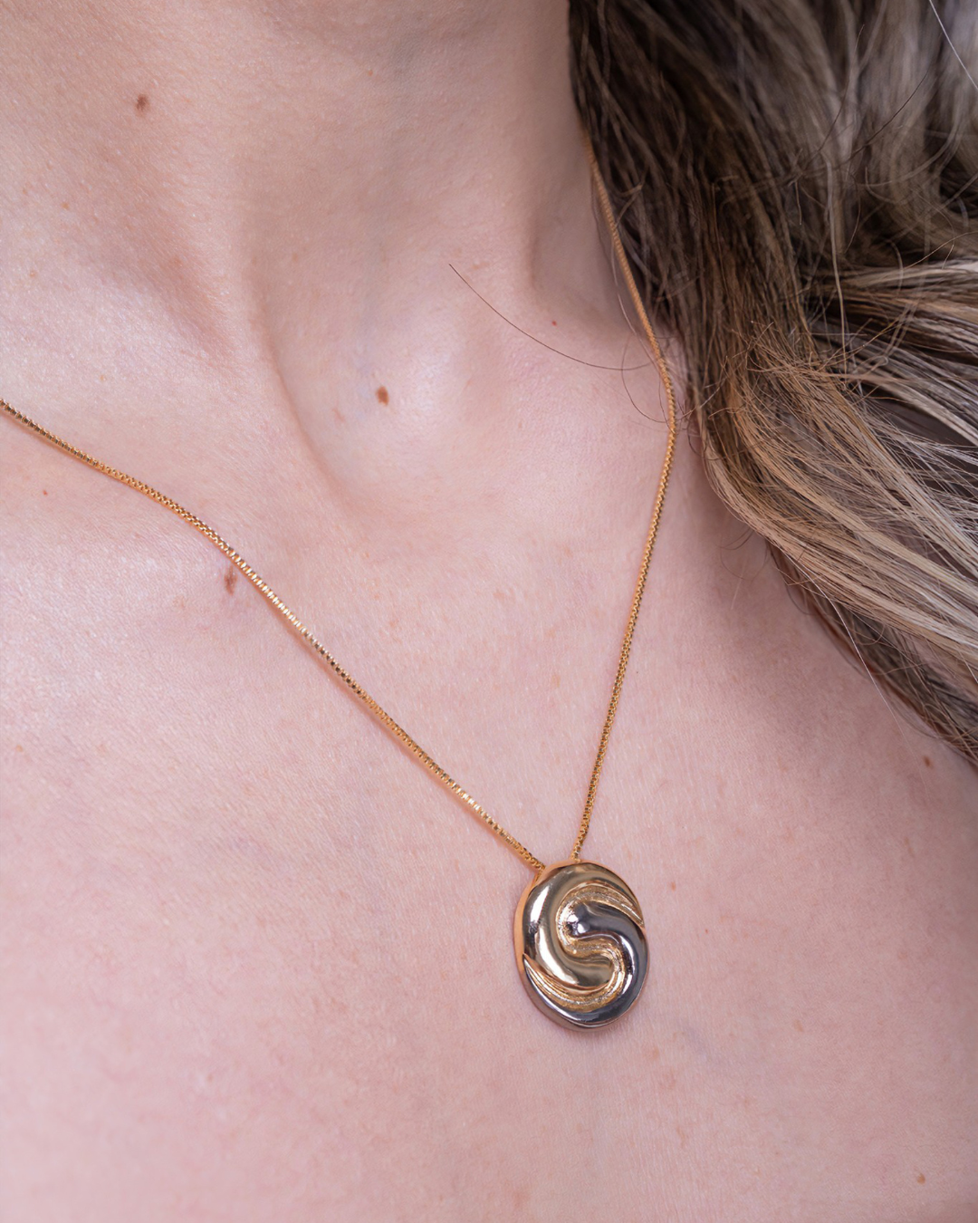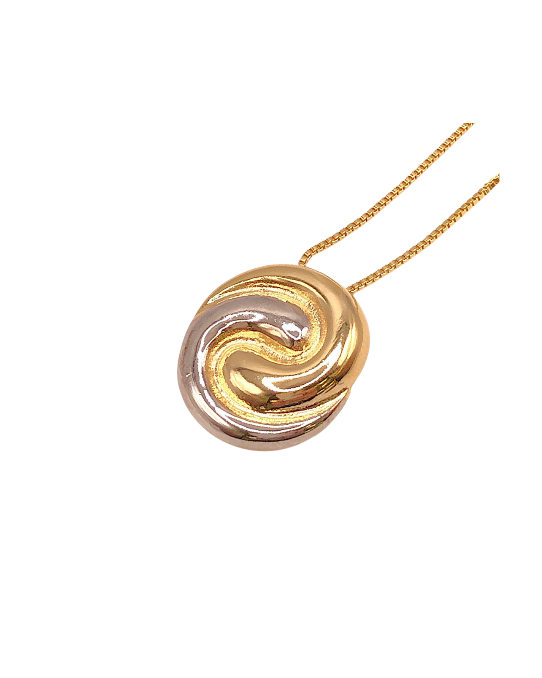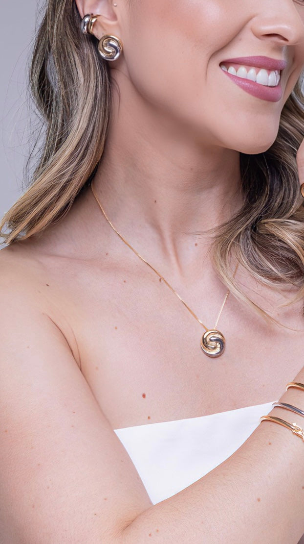 This matching two-tone set in 18k yellow and white gold reflects harmony and balance. Both the pendant and the earrings share the same design, creating a look that connects your essence with the beauty of the earth.